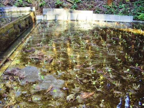 わさびの合間に杉の落ち枝も散らばって山の中のわさび田の