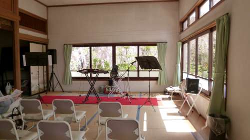 桜コンサートは、この時期に窓の外の桜の花と演奏者を一緒に見ることができるように本堂を開放して行われます。