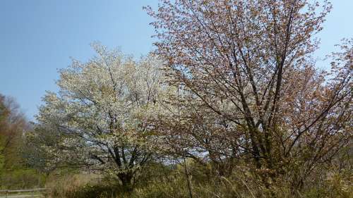 左奧がオオシマザクラ、右手前が山桜です。 この紅白のコントラスト、本當に奇麗です。