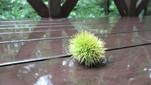 臺風13號のときだけは大雨になり、栗の毬がポトリ。 暑すぎる夏が続いていますが、栗の毬を見て來月から秋(9月)になることを思い出しました。 (寫真は平成30年8月撮影)