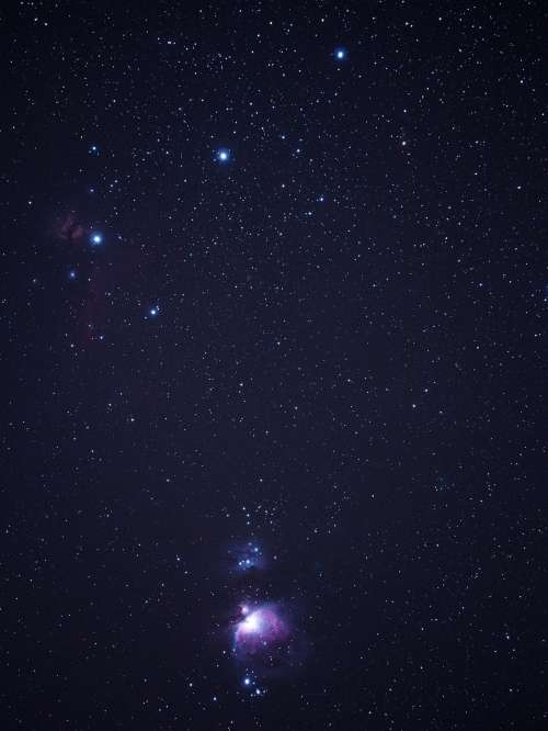 M42(オリオン大星雲)のよくある構図。150mm(300mm相當)f/2.8 ISO-3200 60秒露出。馬頭星雲がかろうじて判別可能。