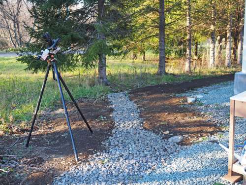 そこで今回、自宅の庭でポータブル赤道儀を用いて望遠ズームで星雲等を拡大撮影してみることにした。広角レンズでの撮影と異なり、さすがに簡易的な極軸合わせではなく北極星が見える位置に赤道儀を設置する必要があるが、家の西側に街燈の影響を受けず、かつ北極星が見える場所があったのでそこにポータブル赤道儀を置いた。