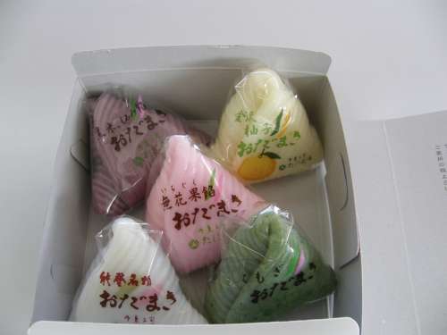 おだまきの種類は5種類。白色(つぶあん)、桃色(いちじくあん)、黃色(柚子入りあん)、