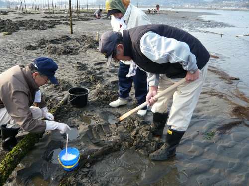 マテガイ採取の3人組、抜きあげの感觸、うーん今年はどうでしょう?