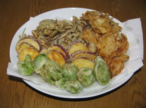 ■蕗の薹(手前)とサツマイモ、タマネギ、ニンジン、ゴボウの天ぷらです