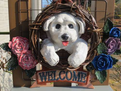 玄関先の、愛犬ミルキーとバラのウエルカムボードです。