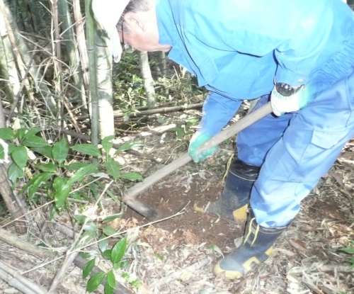 竹の子の生えてる角度を想定し、どちらから山鍬を打ち込むかを瞬時