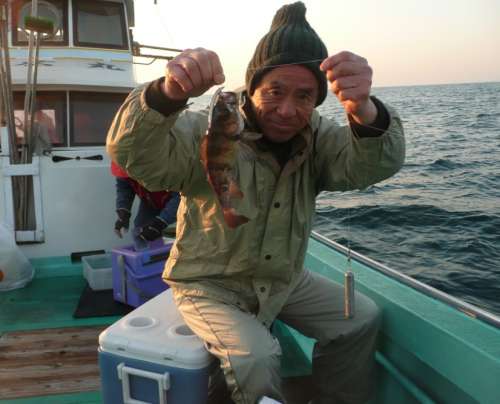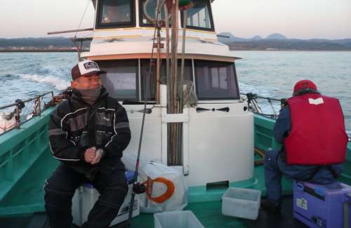 しかも、この釣りの方が楽しめると思われたのか、 參加希望者が定員オーバーで、2班に分かれてもらったために、 幹事役としましては3連投なのでございまする。 26日のPART1の參加者は、オーナー日記のI様、 リゾート入居者最古參のH先生、イリコの釣りの師匠にして、 昨年秋大鯛をモノしたS様、練馬から移住で船の釣りに魅せられた H様、3泊4日で枚方から參加のO様に、 リゾートの住人にはなりそこねたが、友達づきあいが続いている 別府は鉄輪のマッサン氏(仮名)とイリコの7名です。 朝の冷え込みが尋常じゃなく、0度近くまで下がり、6時出船も、 寒さでガタブル狀態でした ◆出発進行!にしても、むっちゃ寒いーですなあ。O様と後ろ向きはI様。