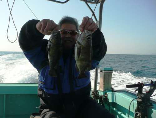 左舷前方のマッサン氏が先陣を切り、まず、めばるの良型をゲット。 同じ左舷艫(後ろ)のS師匠が、立て続けに2本めばちゃんです。