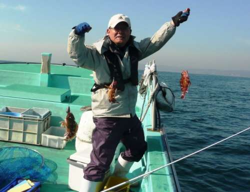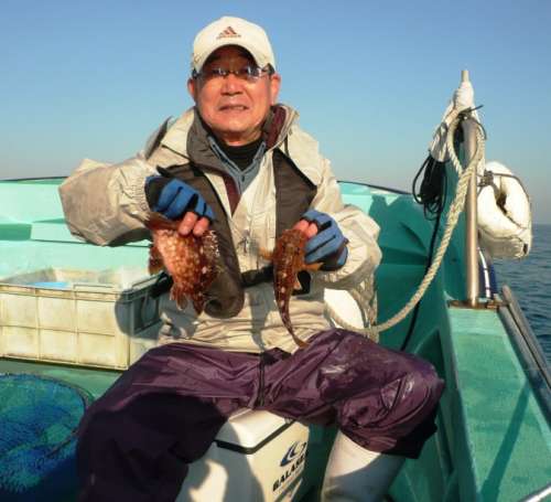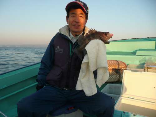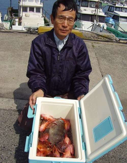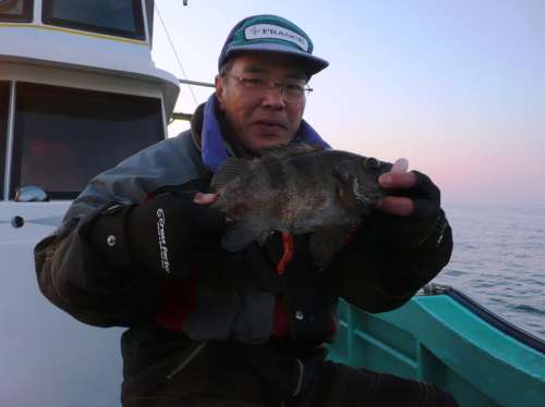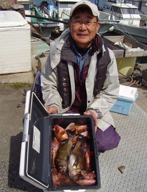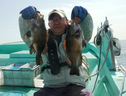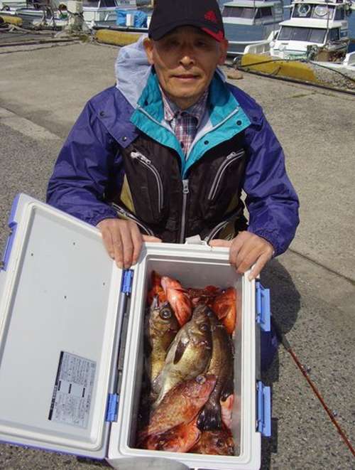 3月27日、前日に引き続いて、第2班のメンバーによる、 富來港の末広丸にての『ホゴ?めばる釣り』でございます。 この日は腕に覚えのある強者揃いで、舳先側にその4名が並んで、 バチバチと射るような視線が飛び交っております。 んなことは全くなく、日頃から行動を共にすることの多い、 気心の知れた和気藹々な仲間なのです。久しぶりの乗合船のT様が、 10年ぶりくらいの富來での釣りですが、底物の帝王、 やっぱりよく釣ります。