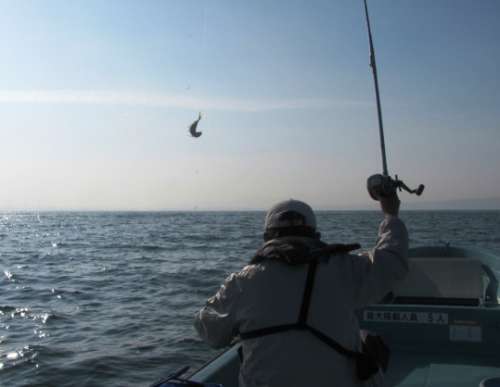 7時半、日の出を背に出港、いつもの真那井沖に到著。 この日は長潮で干潮の底が9時半です。 8時頃からスタートフィッシングですが、ウンともスンともアタりが ありません。今日はダメかなと思いましたが、いえいえ、 潮が動き出した10時前頃から、撒き餌に寄ってきていただろう群れの 『お食事タ~イム!』です。バタバタと釣れ始めました。30分間 くらい、分速1尾ペースです。