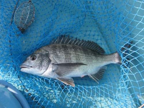 途中、M様に強烈なアタりがあり、この突っ込みは、もしや鯛?と 慎重にやりとり、30cmオーバーの黒鯛(チヌ)でした。
