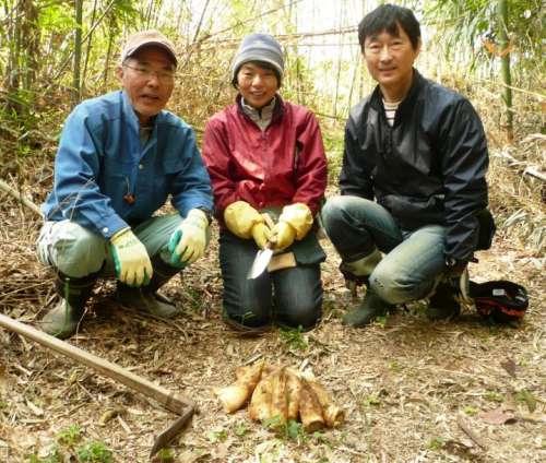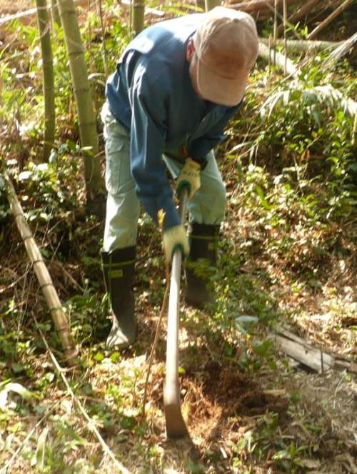 その宴會の翌日、Y様に誘われて、N様、1街區の竹林に、 リゾート産タケノコ掘りの初體験でございます。 京都あたりの竹林と大違いで、竹林と雑木の混在狀況では、 それらしい地面の盛り上がりなど、N様もイリコも、判別に 四苦八苦ですが、さすが、『竹林の王者』Y様、次々に発見