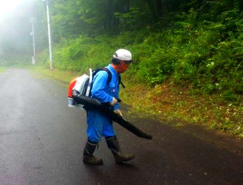 管理員が散らばった草をブロアーという背負いの送風機