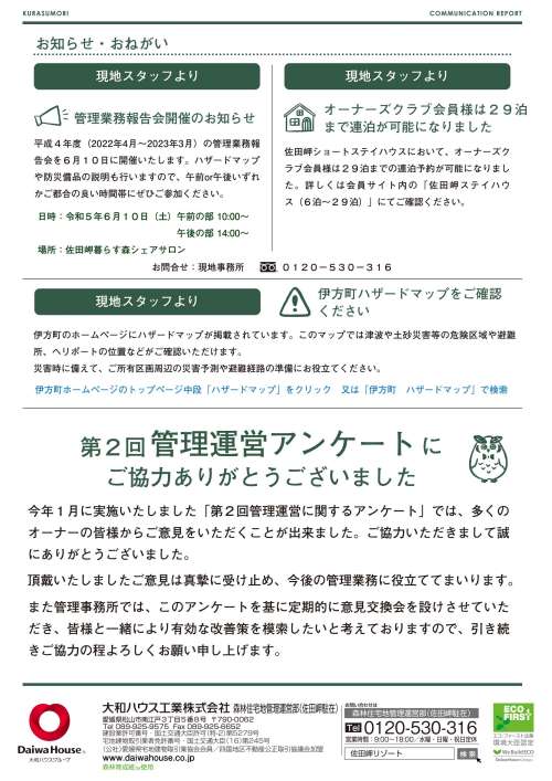 〇ゴミ庫橫掲示板にもコミュニケーションレポート2023年5,6月號を掲示いたします。併せてご確認ください。