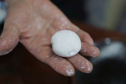 だんごは、もち米とうるち米を獨自の配合で米粉にし、水で練って作ります。