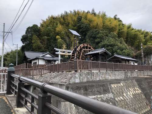 苦竹年禰神社(にがたけとしねじんじゃ)と水車です