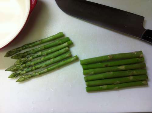 グリーンアスパラガスは根元の固い部分を切り落とし、2等分する。