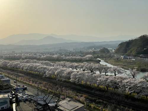 噂にきく、一目千本桜、天候は暑いくらいの気溫、満開でした。