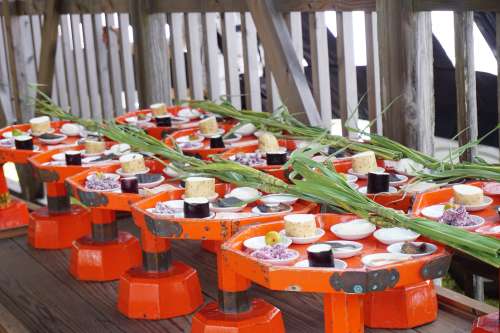 白裝束の女性が頭上に掲げているのは神への供物。御仮屋での休憩時間にそっと覗いてみると、朱色の御膳にはちまきやナス、昆布、梅のような実、餅などが並んでいた。