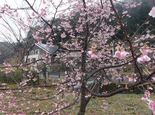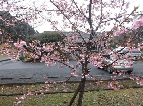 前回のブログでもご紹介した、ロイヤルシテイ霧島妙見臺 現地販売事務所の植込みにある「河津桜」が花を咲かせました。あいにくの小雨天候ですが、ピンク色の可愛らしい花を咲かせています。春本番まには間だ少しありますが、春の訪れを実感することができます