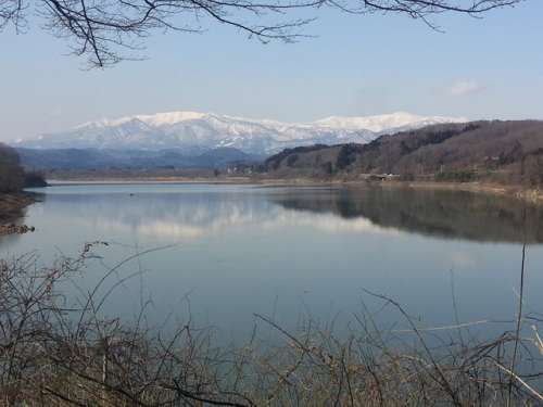 湖面に映る雪の蔵王連峰と桜並木。楽しみです!