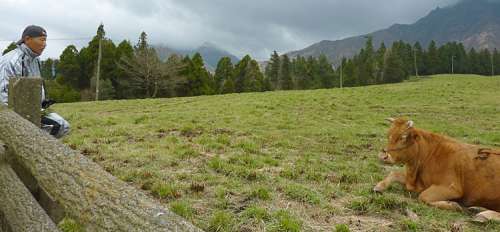 放牧の牛とも顔なじみに。。。「この牛は確か去年、赤ちゃんを産んだ牛だったな。」と大橋さま。