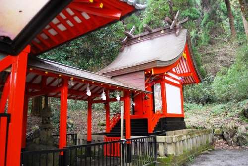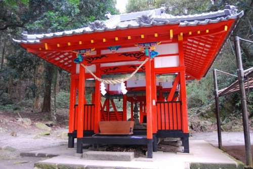 霧島市隼人町 鹿児島神宮の正面鳥居の前を右に抜け、 300mほど進むと、正面に朱色の神橋が見えてきます。 その奧の森の中に鎮座するのは、 安産の神様として有名な 「石體神社」(しゃくたいじんしゃ)です。