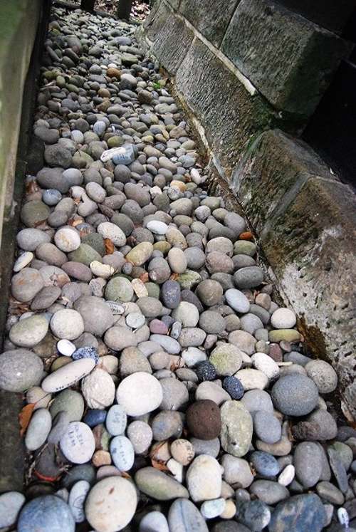 安産や子どもを授かりたい方はお參りをして、 境內の小石を頂いて持ち帰ると玉のような元気な子を 授かると云い伝えられます。 無事に安産を終えたら、そのお返しとして、 河原の清浄な小石を拾い、もう一つ石を添え二つにして返します。 次の妊婦さんのために、そして神様への感謝の意を込めて倍に して返すのだそうです。 戌の日には、神主さんのご祈禱があり、 地元の方だけでなく遠くからも參拝者があるといいます。 社殿の前の石塔や社殿橫には、 安産の願いや生まれてきた子どもの名前と共に、 お禮のメッセージが書かれた小石が沢山並んでいました。