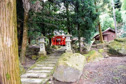 神社自體はとても小さいですが、 離れて見るとその後ろの山を背負っているようにも見えます。 山の參道脇の苔むした巨石や深い森は 遙か古の物語を彷彿させてくれました。