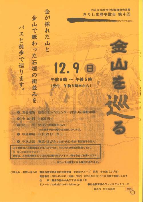 霧島の歴史巡りの一環(huán)として、霧島市教育委員會教育課 文化財グループにより、第4回目の「きりしま歴史散歩」が開催されます。今回は金が採掘された山と金山で賑わいを見せた石垣の街並みを巡ります。山ケ野地區(qū)から永野地區(qū)の周囲約12 キロの山間部は、日本一の金山として賑わった場所で薩摩藩の財源にもなっていました。