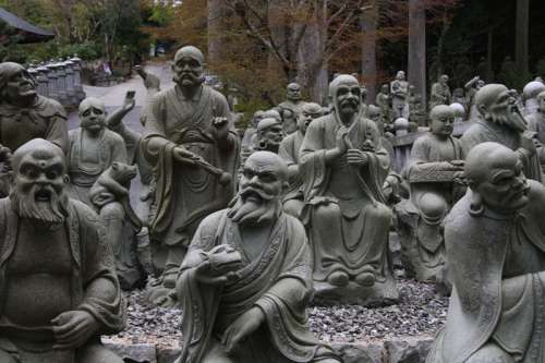 ロープウェイ山頂駅から境內に向かう參道には500體にも及ぶ羅漢像が建ち並んでいます。