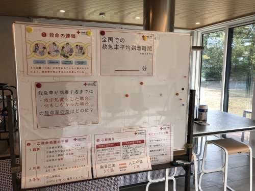 まずは座學からですが、救急車を呼び、それまでの間に我々が救急処置を行う事がいかに大切かを學びました。