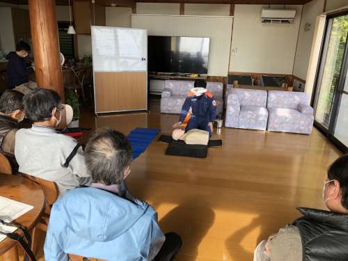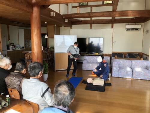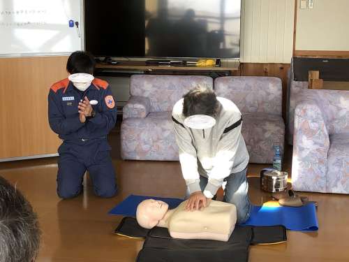 當(dāng)日は、地元消防署より救急救命士の隊員の方にお越しいただき、講義&実踐で行いました。