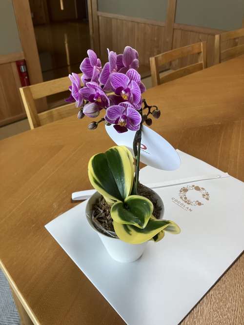 子どもたちが弊社オリジナルミニ胡蝶蘭「COCOLAN(ココラン)」のフラワーアレンジ