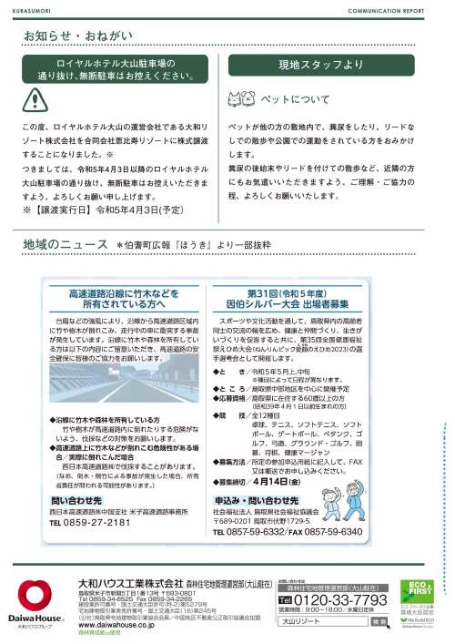 つきましては、令和5年4月3日以降のロイヤルホテル大山駐車場の通り抜け、
