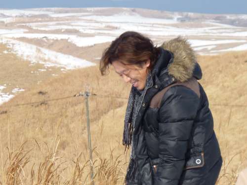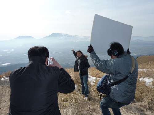 雪の撮影に苦労する撮影陣           大観峰近くで、歩く柳生さんの撮影