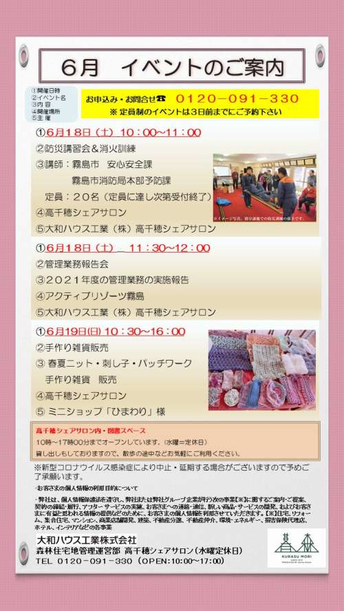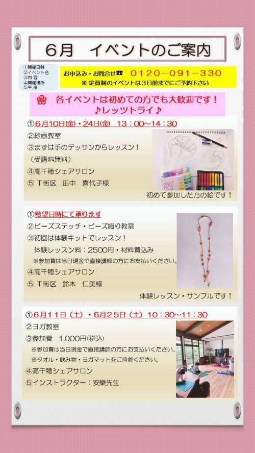 皆様、こんにちは そろそろ梅雨入りも近いようですが いかがお過ごしでしょうか 雨は憂鬱なものですが 素?cái)长蕚悚扦赓Iって、外出する楽しみを 見つけたいですね さて、高千穂シェアサロンにて6月開催予定の イベント一覧を作成しました。 初心者の方でも楽しめるものばかりです! 新たな趣味を見つけてみませんか? 皆様のご參加を心よりお待ちしております