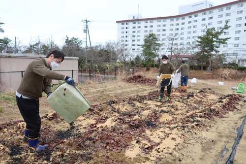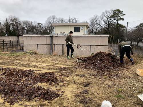 米殻や燻炭,鶏糞などを混ぜて土作りを行いました。