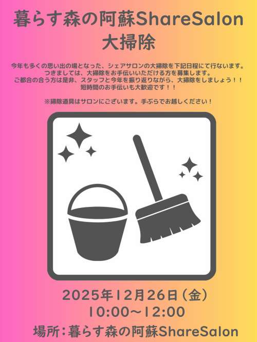 多くの思い出の場所となったシェアサロンの大掃除を下記日程で行ないます。