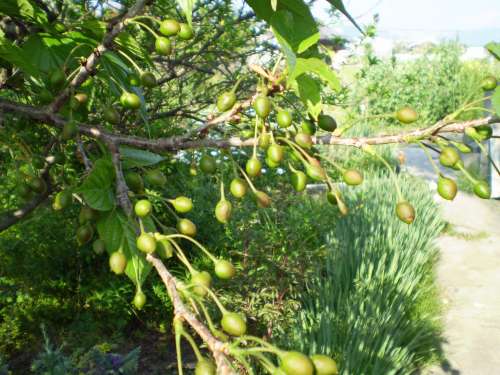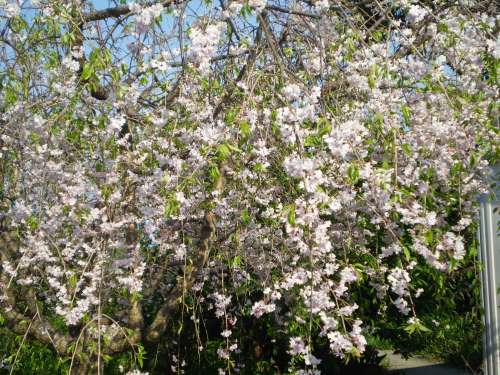 ちなみに、しだれ桜の隣にはサクランボの青い実が鈴生りになっている木を発見。