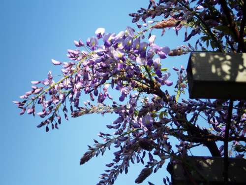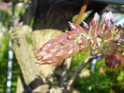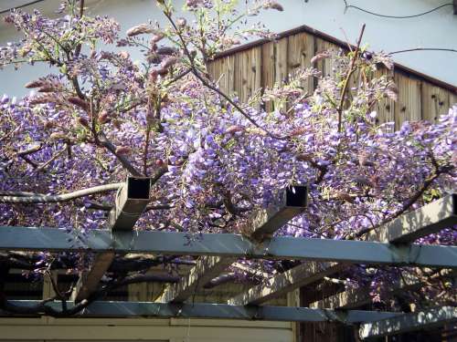 とある民家で手づくりの藤棚に、今まさに咲こうとする藤の花を見つけました。