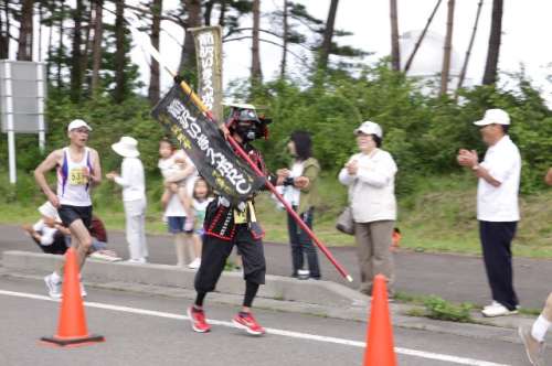 一般10kmに參加する選手は、記録狙い、あるいは勝負にかける意気込みもあってか、早々に入念にウオーミングアップを続けていました。なかには『去年はダスベーダーに扮したんです。今年は伊達正宗での參加』と、とにかくパフォーマンスを楽しもうという異色の仮裝ランナーも。この人もこの人なりに、準備怠り無しという感じでした。
