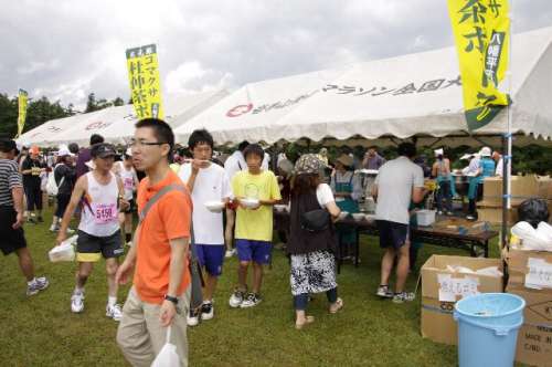 ランナーと応援が一體となったこの巖手山焼走りマラソンの特長は、八幡平市の手作りマラソンにあるということです。市職員はもとより、教育委員會、體育協會、観光協會はじめ、JA、商工會、交通母の會、老人クラブなど240人のボランティアが大會運営を支えているのです。2200人分の豚汁や地元の野菜を提供するなど、わがマラソンを盛り上げようとの姿勢が、參加者の皆さんに大きな共感と感動を與えているようで、開催の度に人気が高まって來ている秘訣もここにあるような気がします。
