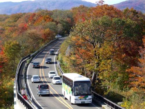 蔵王エコーラインは東から西へ登る山岳道路です。朝のうちに山頂を目指して登ると、陽を背にして走ることになりますから、紅葉が陽に照らされて美しく輝いて見えます。お晝近くや午後になりますと、陽の光は逆光になって、幾分もったいない気がします。反対に、午後からのお時間は、東の遠刈田溫泉街へ向って下り道になりますので、これもまた美しい紅葉、空が澄んでいれば太平洋まで見えてくるでしょう。