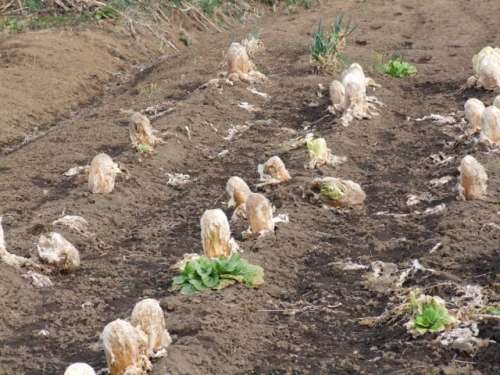 殘念な形???あ、失禮しました。土に還らんとしている白菜のことをお尋ねすると、この狀態で「栽培中」なのだそうです。