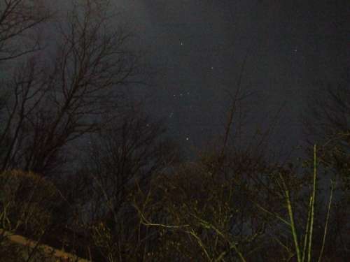 車のエンジンが溫まるまで、車內も外も同じ気溫だと思い、外に出て見上げた夜空には、冬の星座“オリオン座”が木立の向こう側に見えました。