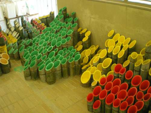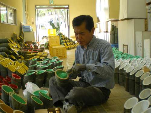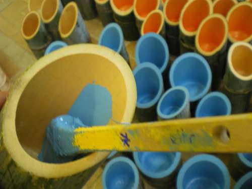 準備は、山から切り出した竹にペンキで色を塗ることから始まります。