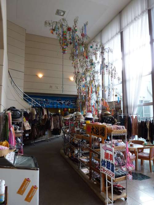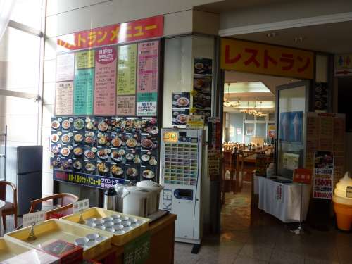 (お土産物や洋服が並んでいます)          (レストランの入口)