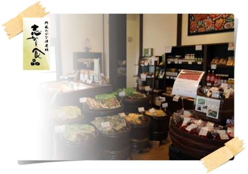 カフェスペースでは、女將さん手作りのおにぎりとのっぺ汁を楽しむことができます。おにぎりに使われている米は、店舗のある産の平(うぶのひら)産。阿蘇市一の宮町坂梨の水源地であり、阿蘇地區の中でもおいしいお米がとれる地域だそう。湧水で洗って炊き、天草の釜炊き塩で握ったものです。また、のっぺ汁は、村上さんのお義母様から受け継いだ味。しいたけ味のさっぱりとしただしの中に根菜類と鶏肉がたっぷり。一口ごとに根菜の味が體に染み込み、體の芯からポカポカと溫まってきます。14種類もの漬物の味見が付いているので、おにぎりとともに味わいながら好みの漬物をご自宅用やお土産用に選ぶのもおすすめです。
